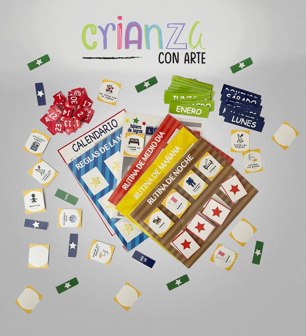 Incluye: kit de mañana, kit de tarde, kit de noche, calendario, reglas de la mesa y tablero de logros.